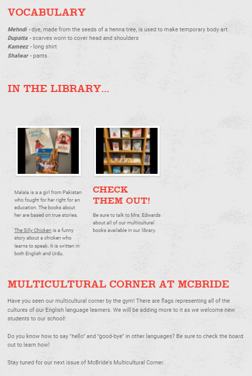 This family engagement project helped build connections with multilingual families and create a welcoming classroom environment for increased learning. Honoring safety protocols set by my school district, I created a multicultural newsletter that featured culturally and linguistically diverse (CLD) families from my school, who volunteered to share about themselves. I called on the families to draw on their funds of knowledge about their heritage culture to educate me, other educators, students, and families at my school. By creating this project, I intended to realize the first two of TESOL’s 6 Principles for Exemplary Teaching of English Learners: Know Your Learners (Principle 1) and Create Conditions for Language Learning (Principle 2). According to TESOL (2018), learning about students and their cultures is a foundation for teachers to build a positive relationship with their students and can help them create effective lesson plans that draw on learners’ background knowledge and prior experiences. Also, when a school offers a welcoming and positive learning environment, ELs can feel safe and engaged in their learning.